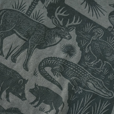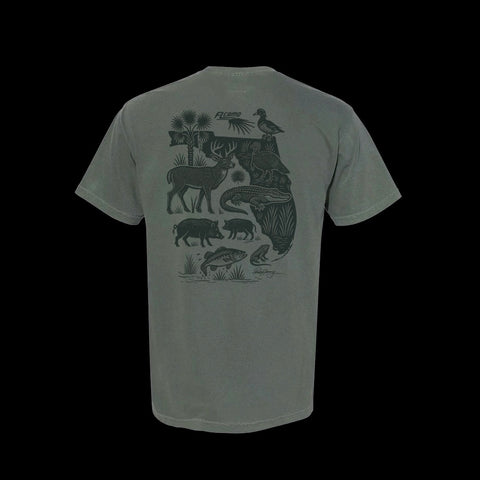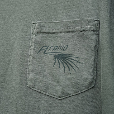 FL Camo "The Florida Sportsman" original custom Design featuring Wood Cut style design created by founding artist Peter Agardy. Classic Comfort Color garment dyed US Cotton Front Pocket T-shirt.