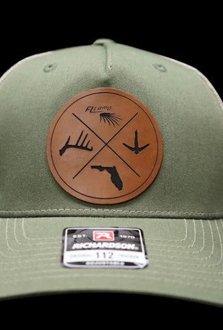 ALL NEW! FL Camo Loden and Khaki Richardson 112 Trucker, Leather Patch Hat. featuring the "Crossroads Design" laser etched logo, turkey foot, deer shed and State of Florida!