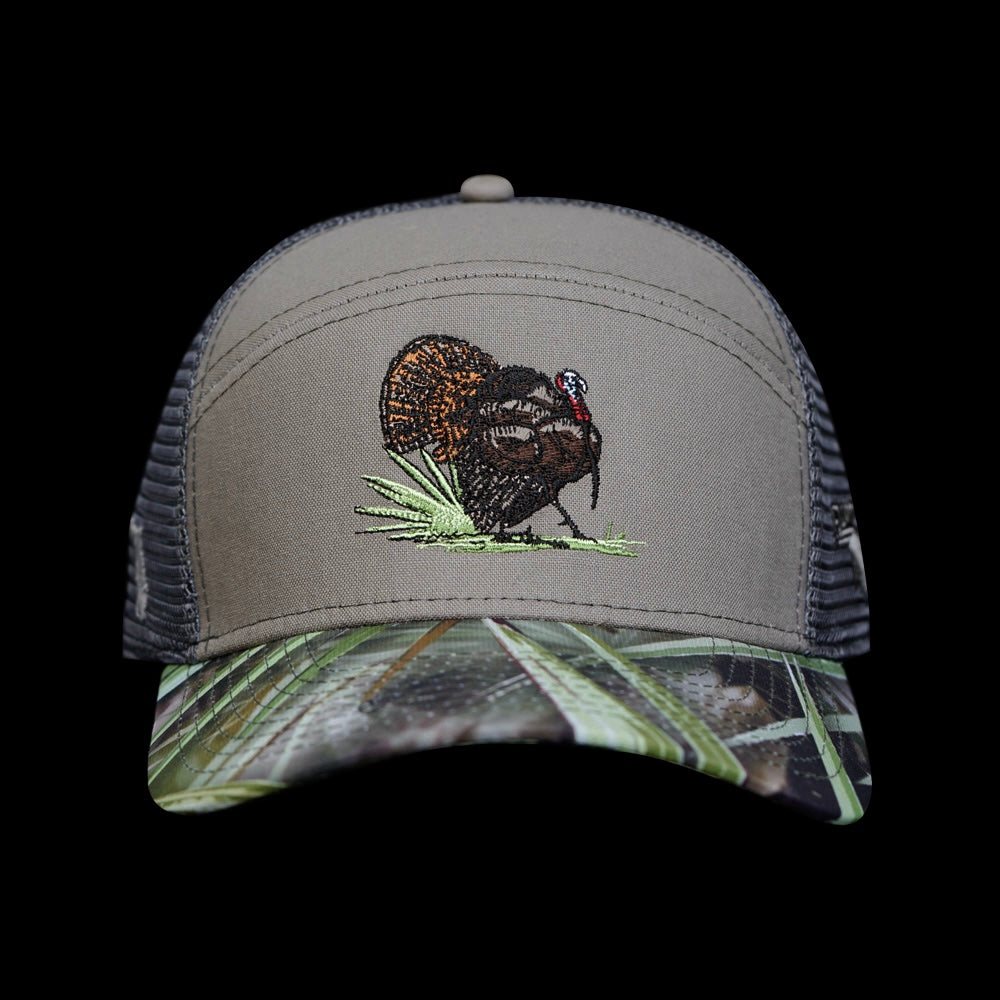 "True Osceola" Custom Embroidered FL Camo original art, inspired by our Sketch Series Osceola Turkey shirt, Florida State on right side and FL Camo logo embroidered on left side panel. Tradesman Style 6 panel, classic Cotton Twill Crown, Lightweight Trucker hat. Snap back OSFA. The Embroidered art Depicts a Strutting Osceola Gobbler, making his way through the palmettos. Your favorite new Turkey season hat!