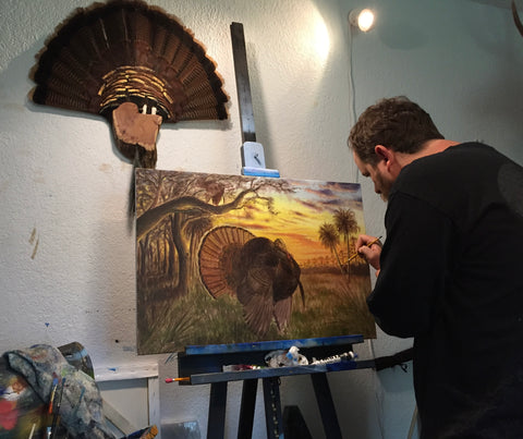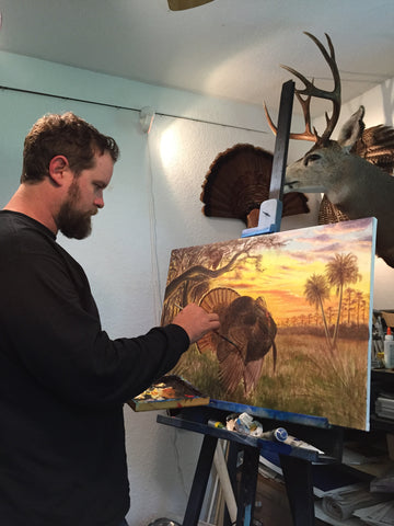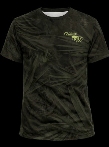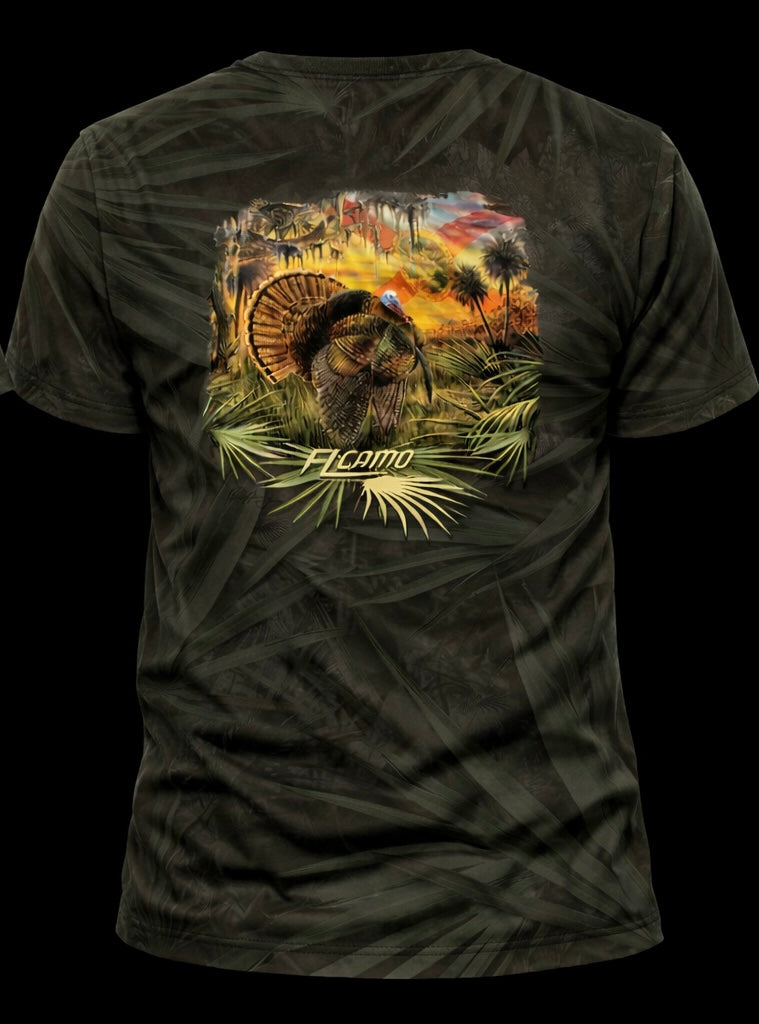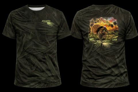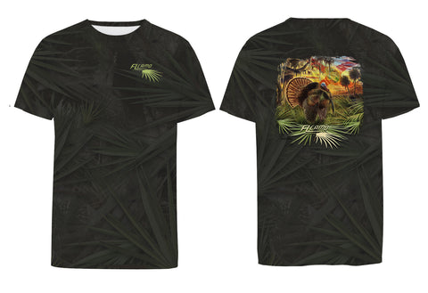 Made in the USA. The “Pure Florida” Osceola design is drawn straight from an original painting by FL Camo’s own Peter Agardy, painted back in 2014. Inspired by countless spring mornings in the South Florida woods, the scene captures the raw beauty of the Osceola's habitat, oak hammocks, cypress heads, cabbage palms, and palmettos. A dominant Osceola longbeard struts just after fly-down, while another gobbler sounds off from the limb above—an image every Florida turkey hunter hopes to experience. The addition of the Florida flag ties it all together, marking this piece as truly Pure Florida. Featured on a "Charcoal ghosted Palmetto Pattern" t-shirt