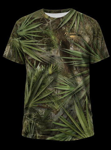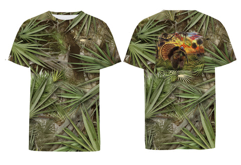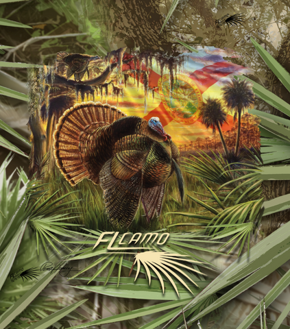 Made in the USA. The “Pure Florida” Osceola design is drawn straight from an original painting by FL Camo’s own Peter Agardy, painted back in 2014. Inspired by countless spring mornings in the South Florida woods, the scene captures the raw beauty of the Osceola's habitat, oak hammocks, cypress heads, cabbage palms, and palmettos. A dominant Osceola longbeard struts just after fly-down, while another gobbler sounds off from the limb above—an image every Florida turkey hunter hopes to experience. The addition of the Florida flag ties it all together, marking this piece as truly Pure Florida. Featured on a Palmetto Pattern t shirt